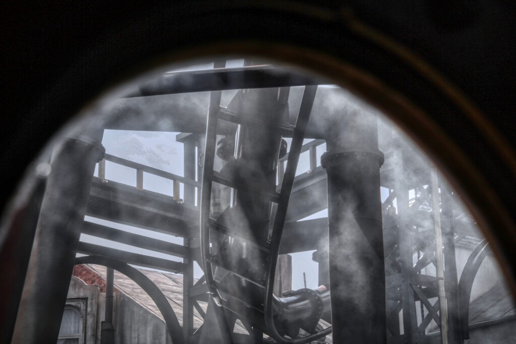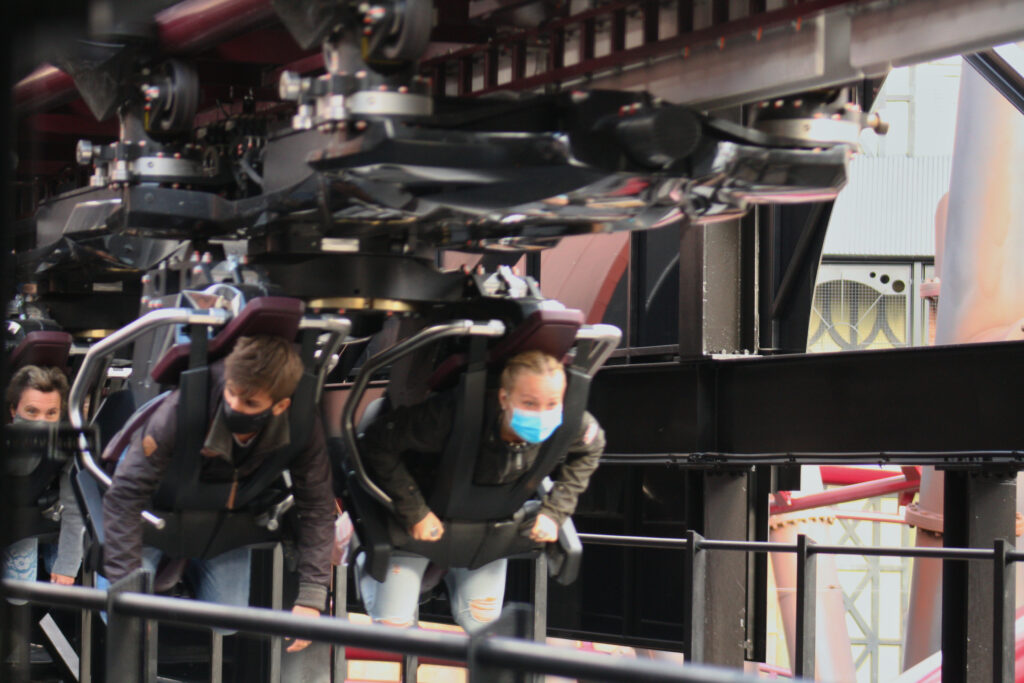 Die Thematisierung des Wartebereiches, der Station und der gesamten Themenwelt ist Wow. Besonders die Effekte. Wenn der Zug rein kommt, färbt sich die Wand von Blau in Rot. Zudem beginnt die Fahrt im Sitzen und man fährt seitlich. Besonders der kurze „Darkride Part“ ist sehr schön geworden. Kurz aber toll. Während man um die Kurve fährt, drehen sich die Sitze nach unten und man liegt. Eine ungewohnte Position, die jedoch nicht unbequem ist. Die Fahrt macht einfach nur Spaß. Es ist ein tolles Fahrgefühl. Man kommt sich vor als ob man fliegt. Man fliegt durch die gesamte Themenwelt. Die Fahrt selbst ist nicht so intensiv wie bei „Taron“ zum Beispiel, aber das gesamt Konzept stimmt. Es macht Spaß, die Thematisierung und die Effekte sind stimmig, die Position ist außergewöhnlich und es ist ein einzigartiges Fahrerlebnis.