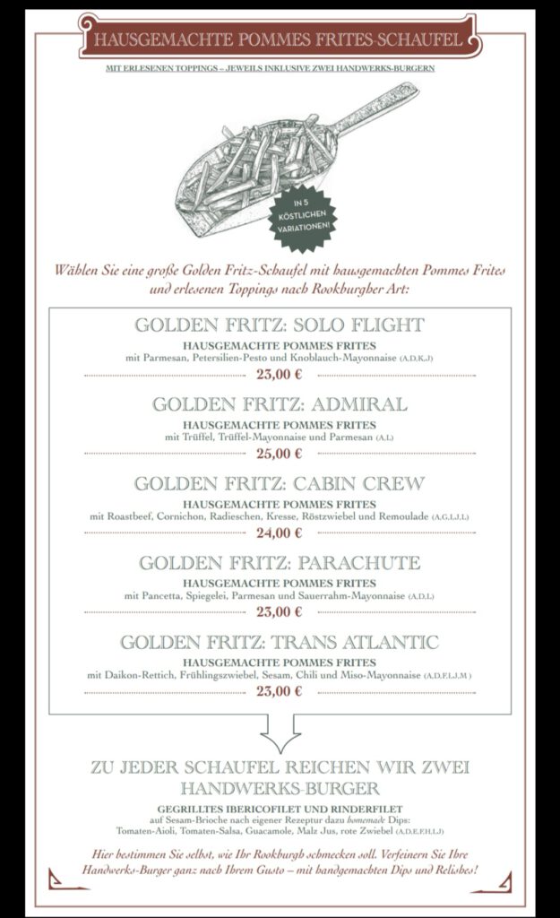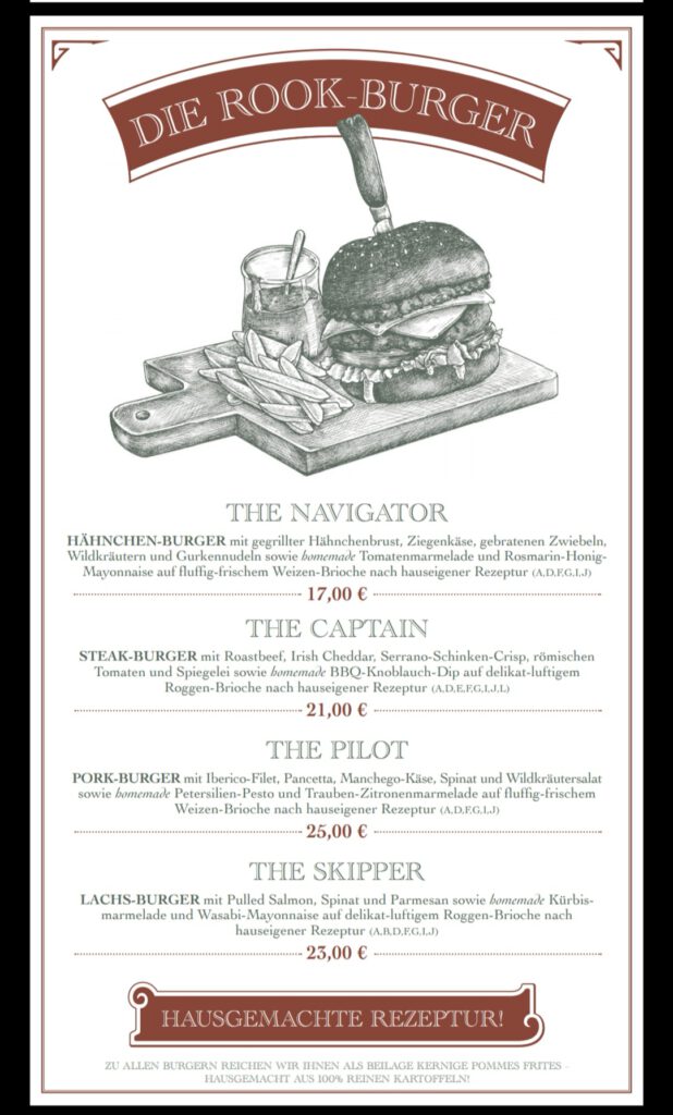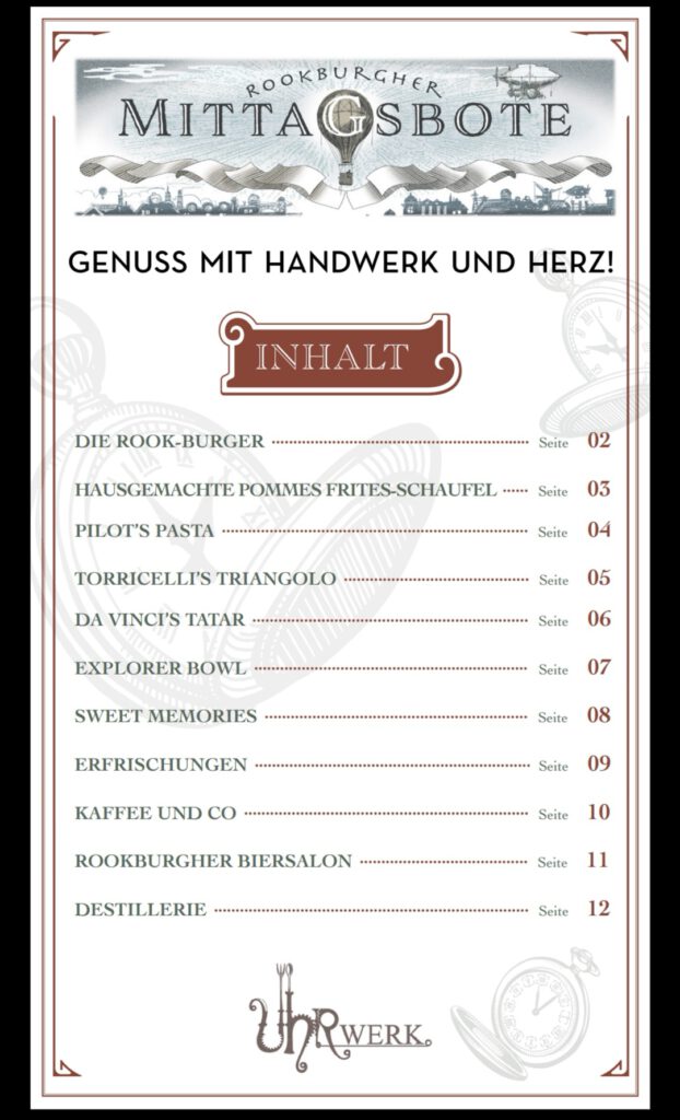 Kommen wir zum Essen. Essen hört sich doch immer gut an. Zu einem gibt es das Restaurant „Uhrwerk“. Dort gibt es verschiedene Sachen wie zum Beispiel Burger, Bowlen oder Pasta. Natürlich gibt es auch verschiedene Nachtische. Preislich ist es etwas teurer aber dafür schmeckt es um so besser. Man sollte es probieren. Hier habe ich auch einen Teil der Speisekarte für euch.